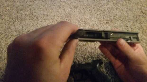 Empezar por tomar el barril y desplazamiento en el marco. La parte ranurada del tubo debe ser mirando hacia usted de la diapositiva.