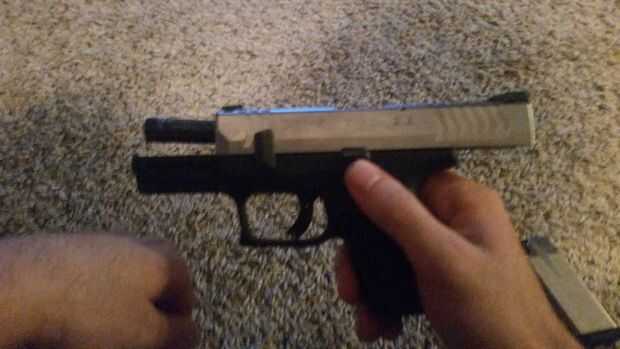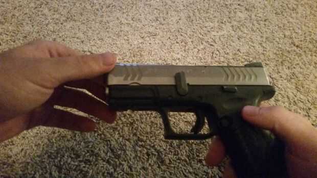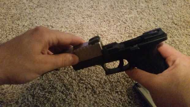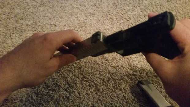 Empuje la corredera hacia atrás hasta puede bloquearla en posición con la palanca de bloqueo de diapositivas.