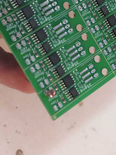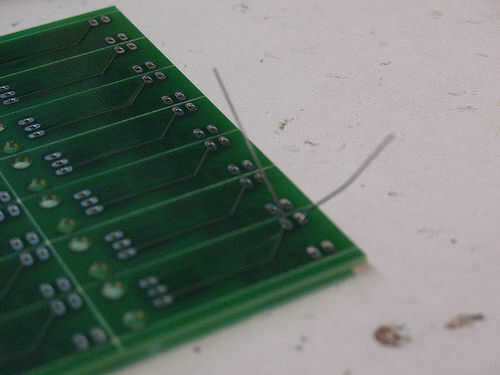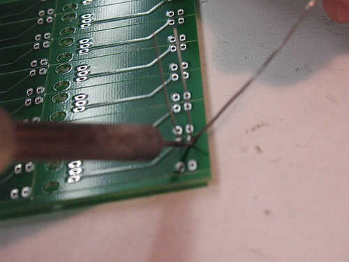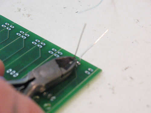 En la parte posterior de la Junta, soldadura de la base de los cables en el anillo metálico alrededor del agujero (Fig. 3). Asegúrese de que hay suficiente soldadura para hacer contacto con el plomo y el metal en el tablero todo el camino alrededor. La soldadura debe hacer una forma de cono.