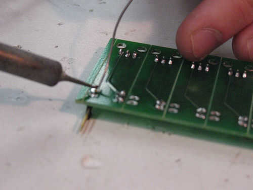 Soldadura los dos pernos (Figura 3) en la parte inferior del tablero de la misma manera que el conector triple. Otra vez forma un cono de soldadura tocando ambos pin y todo el camino alrededor del tablero. Otra vez no hay nada que recorte después de soldar.
