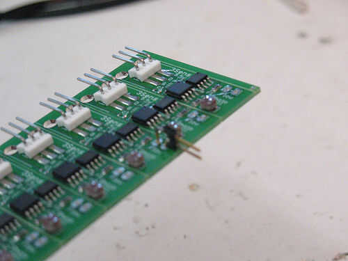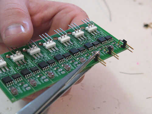 Lugar el conector doble en los dos agujeros marcados "Flow" como se muestra en la primera imagen a continuación. Las dos clavijas que se pega hacia fuera deben ser paralelas al plano de la Junta y los dientes deben ser sobre la parte superior unos a otros en una línea perpendicular al plano de la Junta. Estas piezas no encajen en su lugar por lo que es difícil conseguirlas a permanecer en la línea mientras se suelda. Podría tratar de una abrazadera o inversa (Foto 2) pinzas para sujetar el conector recto mientras le da la vuelta el tablero sobre y la parte inferior de la soldadura.