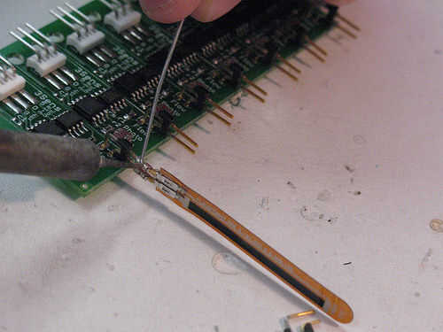 Luego de la soldadura los dientes a las mangas cuadrados en el sensor de flujo (cuadro 2). Rellene el espacio donde se puede ver el entre puntas oro la plata manga de asegurándose de que toca la soldadura de ambas partes. Asegúrese de que no superar las dos clavijas con soldadura. Una vez soldado, ya no podrá deslizar el sensor flexible de los dientes.
