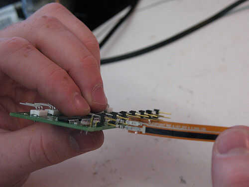 Al agregar el sensor de flujo flexible, simplemente deslice el metal cuadradas mangas sobre las dos clavijas como pueden ir (en la foto). Asegúrese de que el sensor está orientado como en la foto; las letras blancas deben ser derecho hacia arriba y hacia dentro (hacia el sensor de la foto).