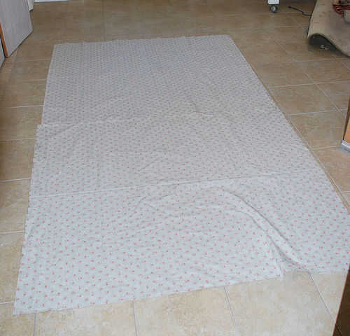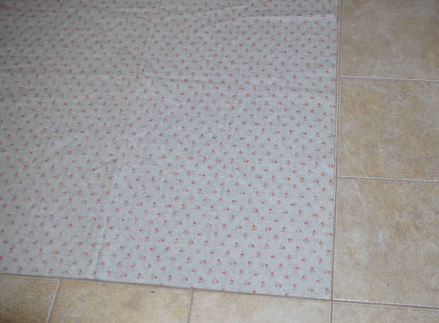 Después de coser a la tela de forro, la pongo sobre una superficie plana (derecha abajo).  Yo solía usar mi piso comedor porque es la superficie plana en mi casa que era bastante grande.  Cuando ponemos en un nuevo piso de baldosas en mi lavadero, encontré una superficie adicional que funciona. Asegúrese de que la tela esté a escuadra con el piso. Los bloques baldosas funcionan bien para esto como lo hacen las líneas en un piso de madera dura.