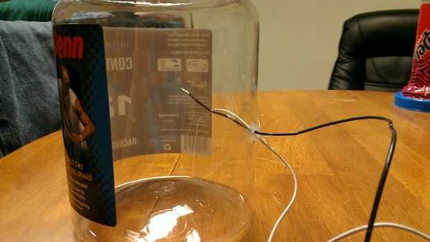 Pase los cables de ignición cerca de tres pulgadas a través del orificio en el lado del contenedor; volver a usar la pistola de pegamento caliente, unte el pegamento en el exterior del agujero con los cables a través de él para evitar que los cables se muevan.