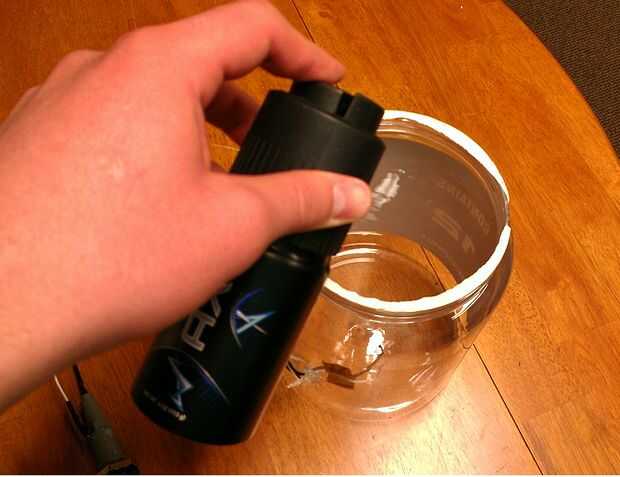 Combustible de encendedor aerosol (Axe) en el recipiente de racquetball durante dos segundos aproximadamente; inmediatamente, selle la girando la tapa firmemente.