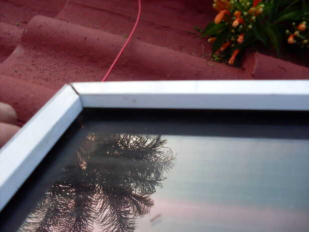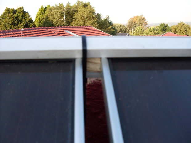 Me uní a la estructura mediante soportes de acero simple y un remache en cada articulación. Como se puede ver, tenía toda la intención de poner en tres remaches por esquina pero me pareció que un remache más que suficiente para mantener unida a la estructura. Los paneles solares están provistos de sus propios sellos de caucho y revestimientos de aluminio. Estos fueron dejados en el lugar para mantener la integridad de los fabricantes de impermeabilizantes.