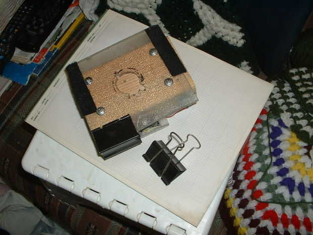 he encontrado una pieza de 2 X 4 que era el tamaño adecuado. Lo siguiente que yo necesitaba era el plástico. Tuve que pieza que era 6 pulgadas y tenía que cortar el mismo largo que el 2 X 4. Pongo los dos junto con 4 tornillos. En la parte inferior donde están los tornillos le puse dos tiras de Velcro. También puse el otro Velcro que empareja en el salpicadero del coche. En la imagen pueden ver la abrazadera que utilizo más tarde para mantener la batería de 9 voltios.