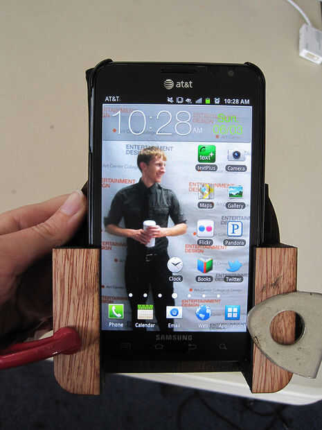 Este dispositivo está diseñado para caber perfectamente un teléfono Galaxy Note en un caso de la cartera de protector. La parte posterior de la montura está diseñado para caber en un compartimiento de vacío en mi Hyundai Accent y para adaptarse a cualquier situación como se puede cambiar. Este diseño también cuenta con una bisagra para permitir al usuario para que apunte el teléfono del conductor o del pasajero, para uso en radio o mapa.