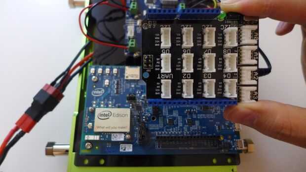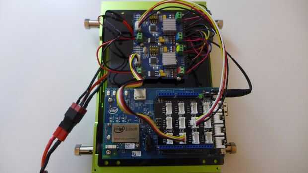 Inserte el protector de arranque sobre el tablero de arranque. Después de eso, conectar los controladores de motor a la pantalla de desbloqueo. Recuerde utilizar los puertos D2 y D7, el firmware incluido utiliza estos dos puertos de salida para conducir los motores PWM.