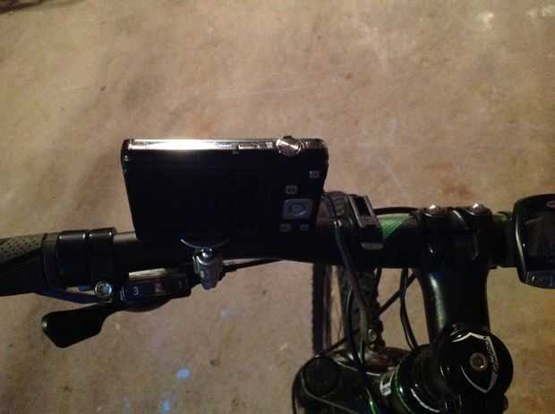 Este montaje funciona con cualquier cámara que tiene un agujero en la parte inferior para enroscar en un trípode. La forma en que funciona es que tiene una abrazadera de tubo (banda) con un perno va a través de él. Los tornillos perno en el orificio de la cámara y la abrazadera para tubería se aprieta en el manillar.
