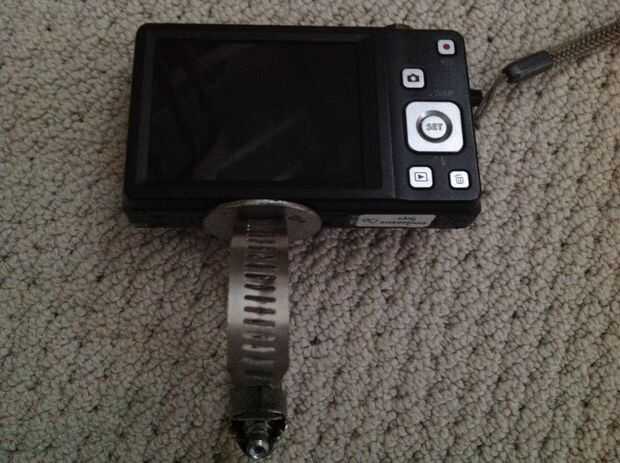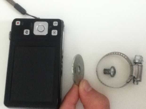 La imagen muestra una vista ampliada de cómo va juntos. El perno va a través de una abrazadera de tubo, la lavadora está en el exterior, y luego atornille en la cámara. La lavadora hace que la cámara más estable proporcionando una superficie plana para él para sentarse.