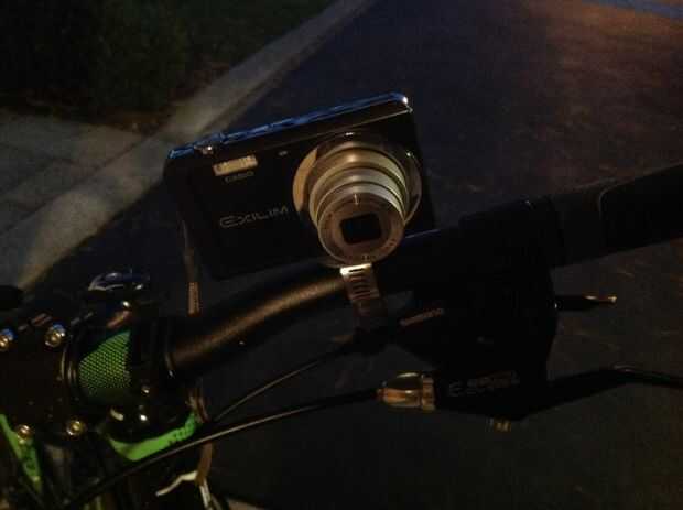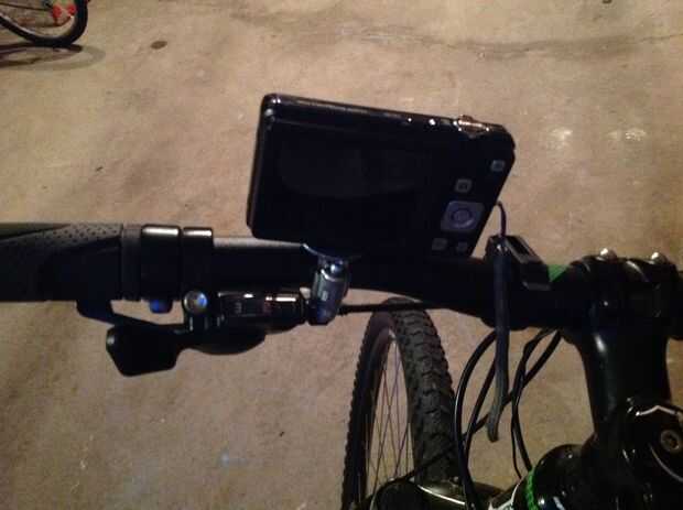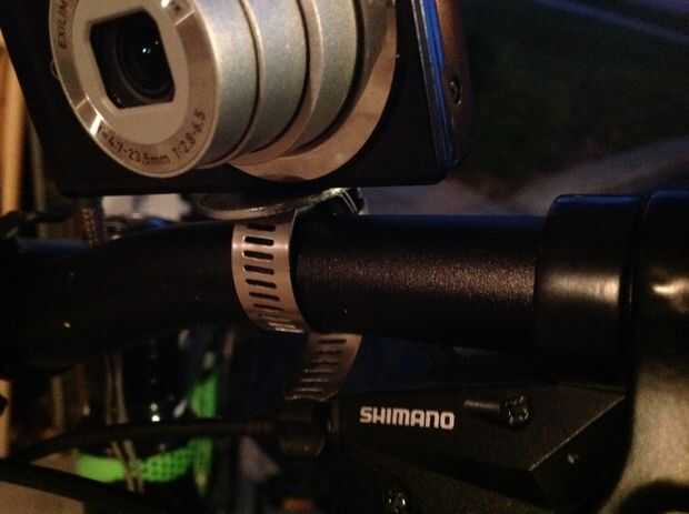 un soporte de cámara para bicicleta que pasa por debajo del manillar.Hecho de Monte luz de cola, un trípode pequeño y barato, ángulo el 90 por ciento para la construcción de una silla.Permite grabar un vídeo de sus paseos sin interferir con las palan