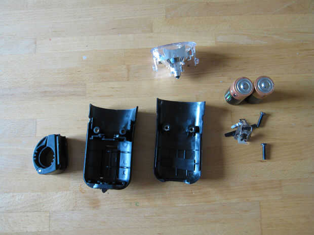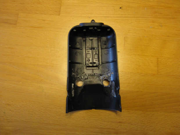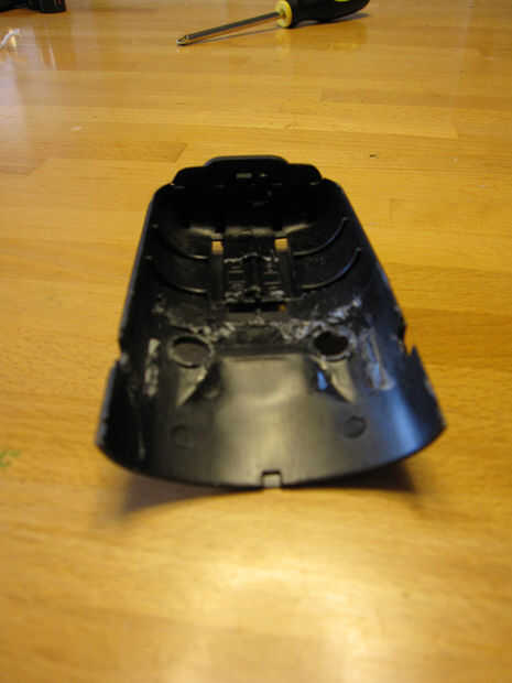 La mitad de la carcasa de la lámpara para el montaje del manillar que tenía algunos soportes de plástico para las pilas y los tornillos así que tuve que recortar abajo con los alicates y navaja x-acto.