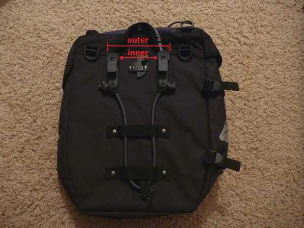 Medir la distancia entre ganchos en alforja. Mina son 3,5 pulgadas internos y externos 5,5 pulgadas así que necesitaré cortar varilla de al menos 6 pulgadas de largo.