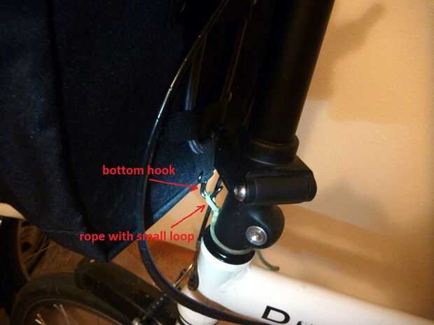 Cortar el trozo de cuerda de aproximadamente 12 pulgadas de largo. Ate el lazo pequeño para coger el gancho inferior de maletas entonces atar la cuerda alrededor del tallo o cabeza como se muestra que no hay suficiente tensión para mantener la alforja se balancee. He utilizado esta configuración en ambos mi bicicleta plegable y trabajan grandes y esperanza trabajará para usted también.