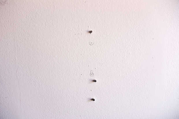 A continuación, para encontrar el pared donde se montar los postes de la placa de deslizamiento, primero marqué lo colocando imanes en las cabezas de los clavos ocultos. Haciendo esto y con cuidado golpeando en la pared, pude aproximar donde estaba el centro de la viga.