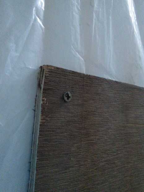 I primero perforar un hoyo profundo en la pared a través de la madera, luego rellena con palillos de dientes para los tornillos de agarre y envió los tornillos con un taladro.