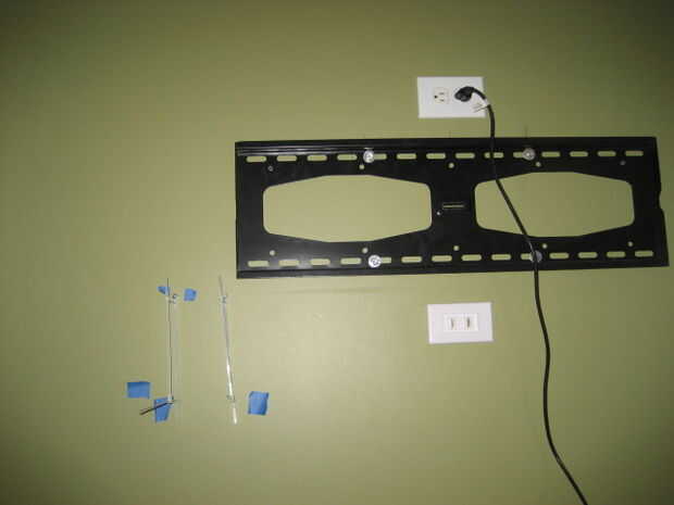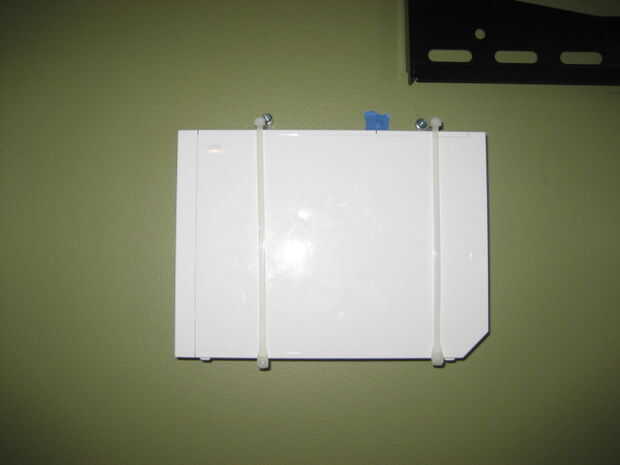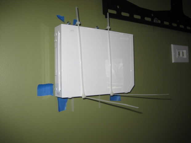 Utilizando las marcas de cinta adhesiva de un paso anterior, Monte las eslingas a la pared. Esto es donde se use el detector de montantes y el nivel. Yo era capaz de montar el primer tornillo en un montante. Usé un anclaje de paneles de yeso para el segundo. En mi primer intento me hice las gomas un poco demasiado cerca. Puedes ver los que mudamos en la última foto. Asegúrese de que se obstruya la ventilación por debajo. ¿Cuando estás feliz? Cortar todos los lazos. Retire la Wii de las eslingas.