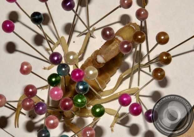A continuación, insertando alfileres sobre Cruz, establezca las pinzas en la posición deseada. Luego, bajar progresivamente el cuerpo, las piernas en su lugar, la fijación y finalmente utilizar una serie de pernos de cruz sobre fijar la cola si no planea elevarlo o enrularlo. Especímenes de Museo (fijados según la norma científica) son siempre cubrió con la cola recta y plana detrás del cuerpo, no provoca como he hecho aquí o rizado al lado como usted encontrará a menudo en ejemplares enmarcados de mentira.