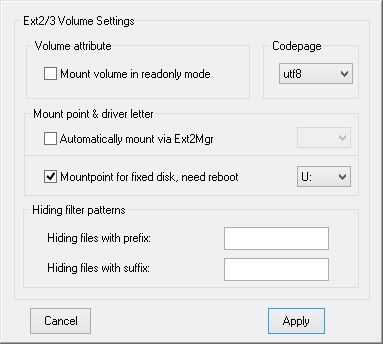 En Ubuntu, tengo dos particiones, el sistema y los datos del usuario uno. Aquí montar ambos. Para montar una partición, simplemente haga doble clic en la lista, seleccione "Punto de montaje para disco fijo, necesita reiniciar el sistema" y seleccione la letra o número que desea asignarle. Le asigné a la partición de datos de usuario y S a la partición del sistema.