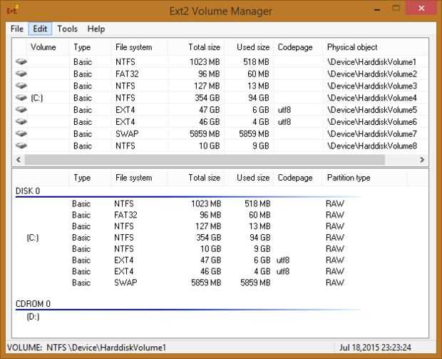 Cuando abres ext2fsd, se te presentará una lista de todas las particiones en todas las unidades presentes en el sistema.