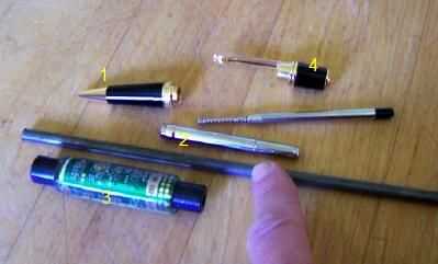 He añadido los números a la foto de las partes de la pluma. Atornille el tubo separador (2) en la parte inferior del cañón (1). Deslice el cañón acabado en blanco (3) sobre el tubo separador (2). Pensar sobre qué parte del circuito patrón desea que el clip de bolsillo encima y alinéelo con el cañón de la pluma. Presione el casquillo de la pluma y el clip (4) en el extremo del barril espacio en blanco (3). Desenroscar la parte inferior del cañón (1) e inserte la recarga de tinta.
