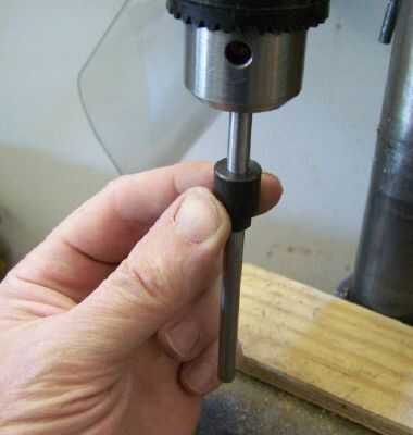 El plan es la varilla de 1/4 de pulgada de la tirada en mi taladro y ligeramente la varilla mientras el taladro está funcionando en su velocidad más baja de aproximadamente 500 rpm. En la foto puedes ver comenzó cerca de la parte inferior de la varilla y guardada hasta que apenas uno de los bujes se resbale en la varilla de 1/4 de pulgada. Entonces el archivo un poco por encima de donde el buje detenida hasta que el casquillo se deslice más lejos en la varilla. Hay un montón de detener el taladro, comprobar el ajuste y volver a empezar a presentar más. Sin embargo, en muy poco tiempo había redimensionado la varilla de 1/4 de pulgada de los bujes de mandril. Ya estaba quitando sólo un poco de material de la varilla y la presentación se hace por lento rpm, hubo poco peligro que la varilla iría fuera de redondo.