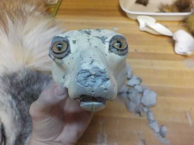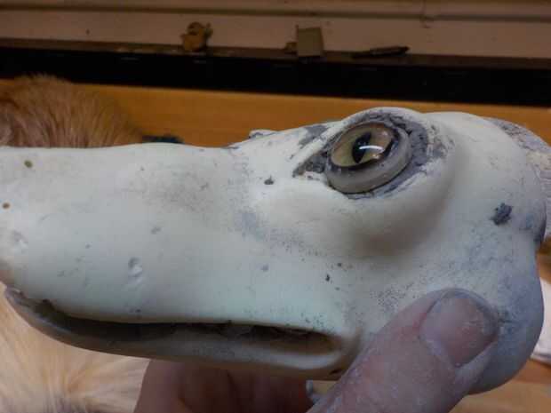 La mala calidad de esta pieza se hizo más evidente una vez que el formulario estaba fuera de la piel. Allí era muchos agrietado, secado arcilla caiga por todos lados y los ojos, que no eran sólo mal colocado, no tenía virtualmente ninguna arcilla alrededor de ellos, que es probable que lo que ha añadido a este aspecto de la cabeza a fox"plana". Además, la nariz y los labios fueron tallados hacia fuera muy torcido y también ampliamente. Este pobre fox necesita un montón de trabajo!