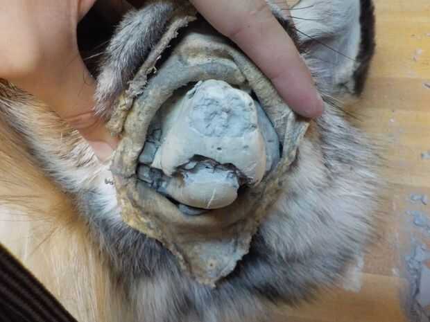 Salió bastante fácilmente después de esto, especialmente desde que el taxidermista no había utilizado absolutamente ninguna pasta de cualquier tipo en el formulario. Si tienes una montura que estuviera pegada a la forma, remojo adicional puede requerirse para ayudar a quitarlo. Una vez más, tenga mucho cuidado en su manejo para evitar dañar la piel.