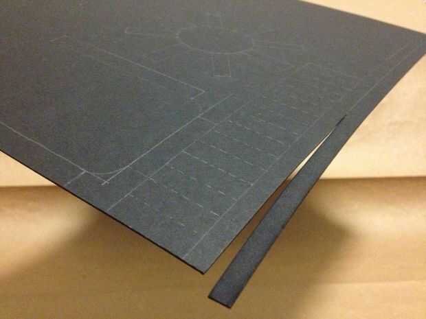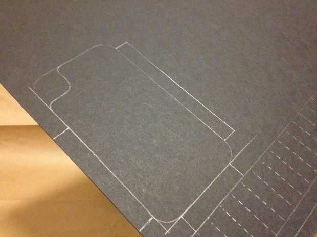 5. Trace una línea alrededor de tu teléfono y dejar un 1/16 en frontera para compensar cuando el cartón se dobla. A lo largo de los lados de su contorno de teléfonos, dejar una solapa de 1cm para permitir la conexión con los marcos de apoyo. Mantuve la solapa en el lado con los botones justo debajo de (-) botón de volumen para permitir un instante punto de parada. Esto ayuda a una visualización de imagen consistente.