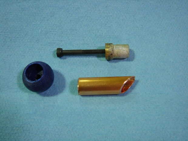 Ahora tenemos que conseguir todas las piezas para el montaje. La placa de fijación del Nuvi se fija a la montura de ventosa con una bola y enartrosis. La poción de bola esto es 17mm de diámetro y plástico. En orden para que funcione usted tendrá que comprar o hacer una nueva bola. Tener acceso a una máquina de prototipos rápidos FDM eligió simplemente modelar la pelota en ABS. Cabe como modelar pero el acabado áspero para una sensación de ajuste notchy. Por lo que modeló otra bola 0.5mm gran tamaño y enarenó ligeramente el exterior para suavizar los bordes. Esta versión lijada ajuste y sentía exactamente como la bola de la fábrica. La bola tiene un agujero para un tornillo de casquillo cabeza hueca de M3 y un contador en un lado de la cabeza del tornillo. Al otro lado de la bola tiene un contador de 3/8 diámetro para caber en un enchufe de cobre amarillo dado vuelta. Este enchufe es aprovechado para la M3 y la parte posterior se reduce para caber dentro de la tubería de cobre.