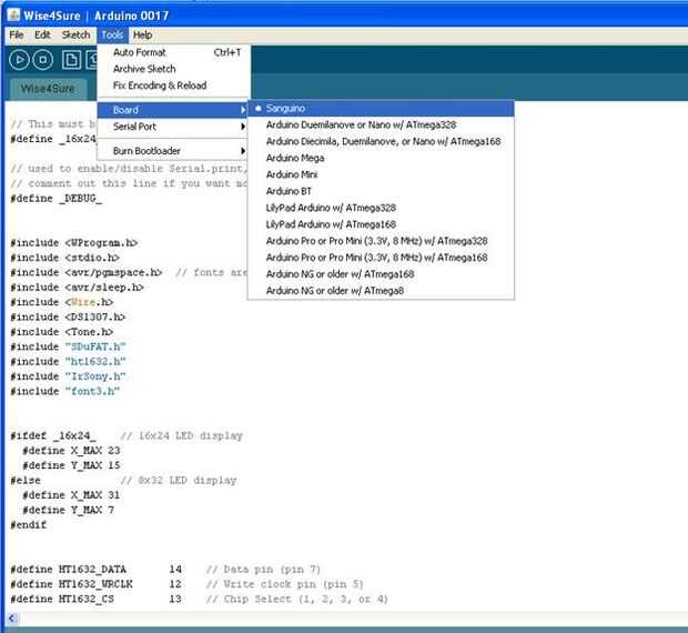 4. abrir el dibujo sabio reloj en IDE de Arduino y compilarlo.