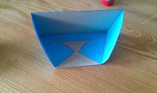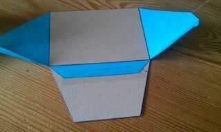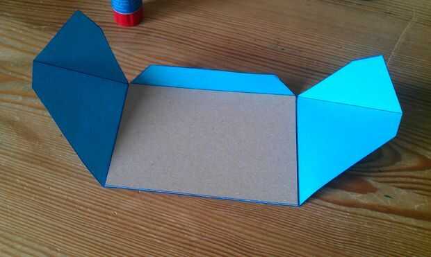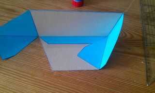 En primer lugar, pegar el rectángulo en la parte posterior, como se muestra en la primera imagen. A continuación, pegue el pedazo largo, pequeño de papel en el lado largo de la cartulina en forma de trapecio y fijar con alguna cinta. Luego pegue los otros dos trozos de papel en la cartulina (Mostrar las imágenes, cómo usted debe hacerlo) y fijarla con un poco de cinta.