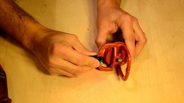 Utilizar la dremel para lijar el interior de la manija en la parte superior. Tome uno de los empalmes de eslabón giratorio para medir el grosor.