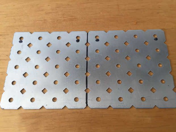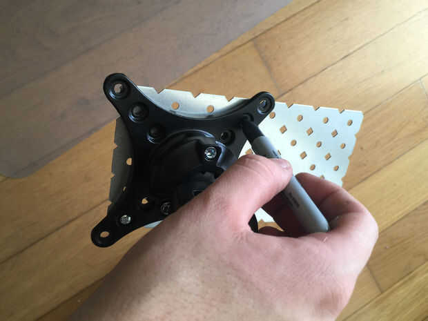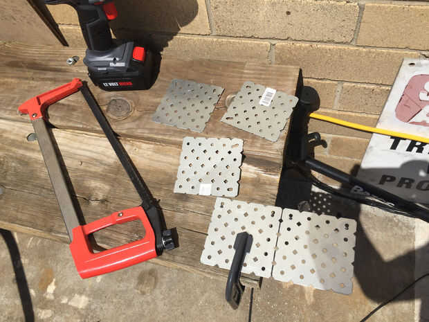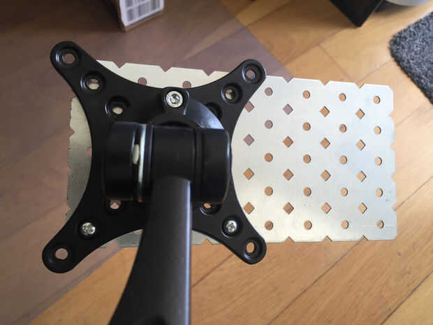 1) el enrejado / soporte personalizado he comprado de Bunnings almacén convenientemente alineada con 2 agujeros de plato en el soporte de monitor VESA. Hay tres conjuntos de plantillas VESA pero he seleccionado un medio porque la línea ya de 2 agujeros. Poner dos tornillos y tuercas en estos, luego con el marcador permanente, marque donde deben hacerse los otros dos agujeros. También la marca donde tiene que cortar la placa para que se queden con el plato cuadrado sólo
