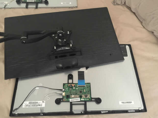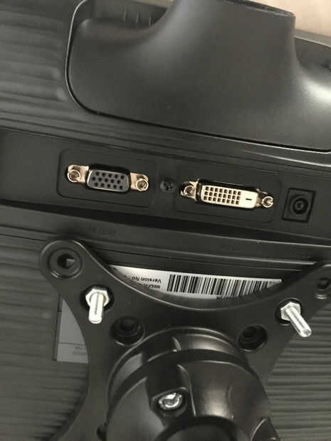 2) no importa que hagas primero; volver a la pantalla LCD entonces Fije el brazo, o colocar en el brazo primero clip el respaldo en la pantalla LCD. He elegido este último: Sujete la parte posterior de la pantalla LCD (que todavía está separada) al brazo VESA, simplemente poniendo el soporte de brazo vesa a través de los tornillos que deben meter por la parte trasera, y luego apretar con las tuercas de tamaño correcto: