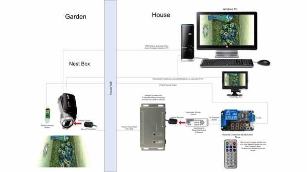 Un repetidor de infrarrojos está instalado en la caja nido para enviar códigos de control de infrarrojos a la videocámara. La caja de control repetidor tiene un receptor infrarrojo conectado en un extremo para recibir la señal de control remoto desde el auricular. El auricular es controlado por el PIR en la caja nido o el temporizador de retransmisión. El cable viene con el kit detector de infrarrojos.