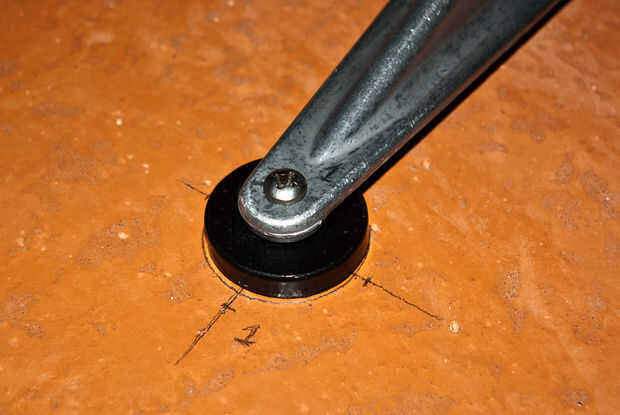Las fotos de este paso muestran cómo el Monte en lugar de pegar, pero en lugar de una silla, estoy usando estos montajes sobre una mesa concreto para que puedo montar a una tabla de contrato base.
