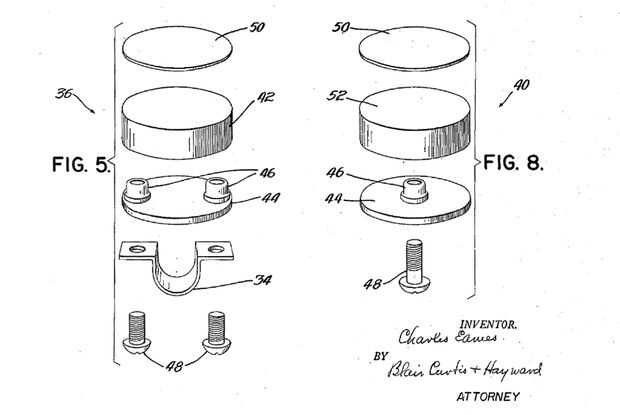 Casi todo lo que necesitas saber sobre montajes de choque se detalla en la patente de construcción de montaje de choque de muebles (US2649136), presentado en 1947. Aunque los dibujos de la patente son para una silla del banquete del prototipo, el concepto es muy similar para las sillas más adelante. La patente va en detalles acerca de la construcción, el tipo de caucho y adhesivos utilizados para hacer montajes de choque.