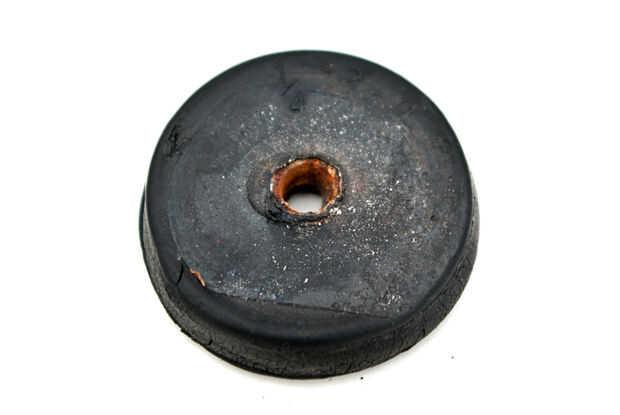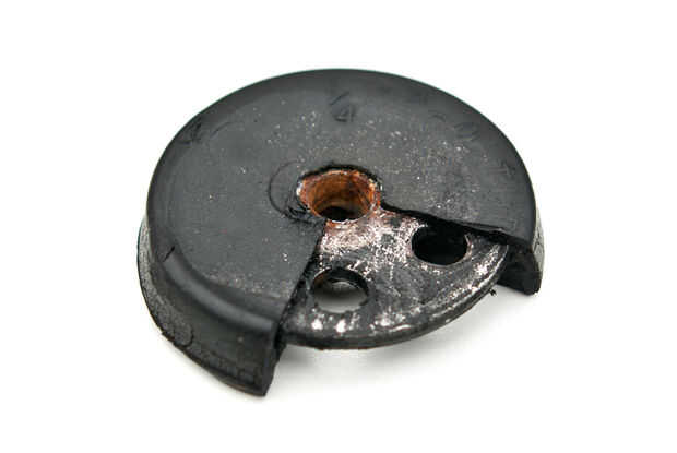 La vista en corte del Monte muestra cómo la pieza de hardware es echada en la goma (esto es lo que las roscas de perno en enganchar la cáscara a la base). El hardware estándar más cercano disponible se llama una tuerca de soldadura, y las utilizadas aquí son hechas por Rotaloc.