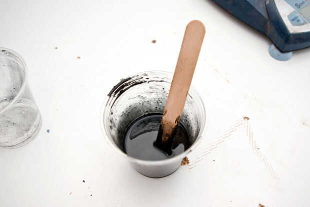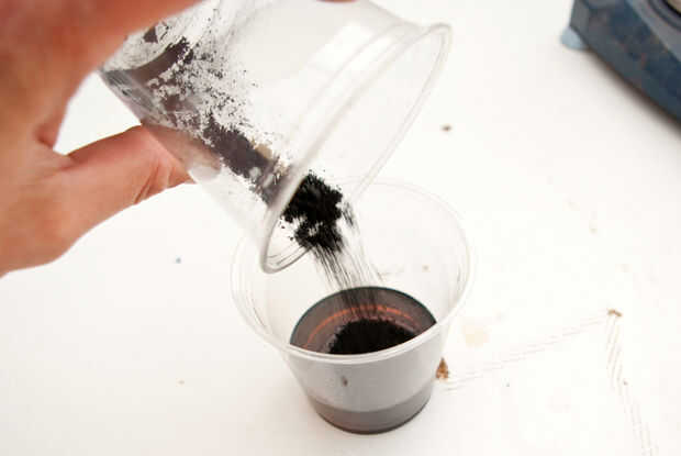 Añadir el pigmento y la mezcla, asegurándose de que romper el pigmento hasta que quede un color negro uniforme. Raspe los lados y el fondo de la taza para asegurarse de que el pigmento se mezcla bien. Ser exhaustiva.