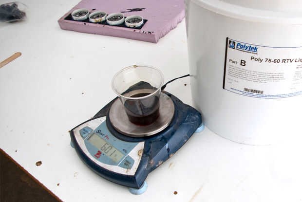 Pesar 60 g de la parte más viscosa, en el caso de Polytek 75-60, que es parte de B. mezcla el pigmento en la parte que es la más fluida es mejor.
