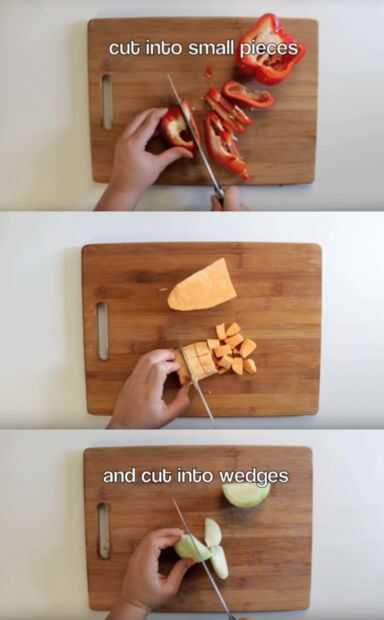 Pelar las batatas y cortar en cubos pequeños.