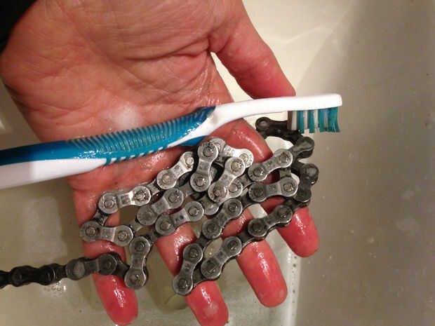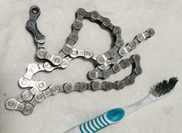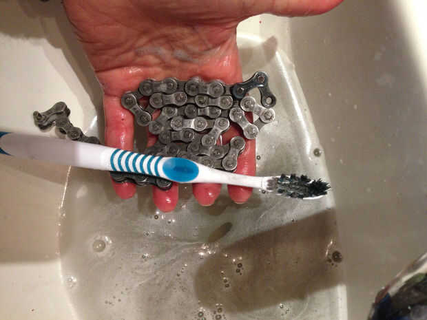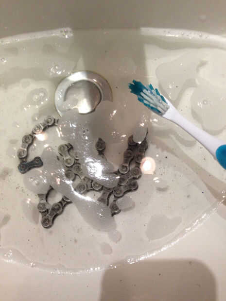Te recomiendo limpiar la suciedad y la grasa de la cadena de la bicicleta usando agua tibia y jabón o un desengrasante y un cepillo de dientes viejo para limpiar, antes de comenzar este proyecto.