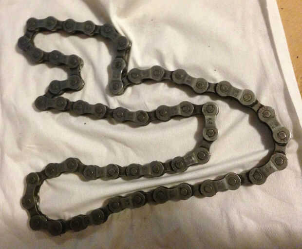 Tomar los dos extremos de la sección de enlaces contados, menear el enlace interno en un extremo de la cadena entre el enlace externo en el otro extremo de la cadena y colocarlo en la rotura de la cadena.