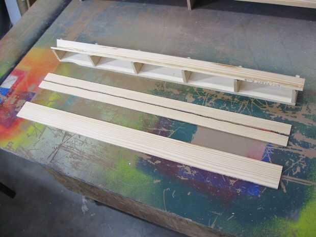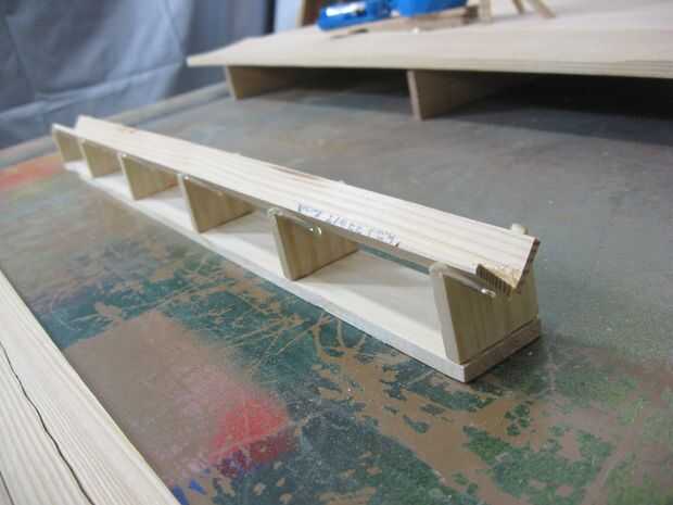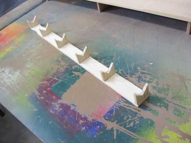 La pista es hecha por pegar dos tiras de 3/4" en forma de V. Las tiras fueron hechas cortando los listones delgados de la Junta de 20 pulgadas por la mitad con una sierra de banda.
