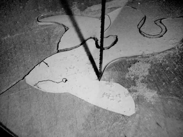 Utilizando una sierra de calar con hoja espiral corta las piezas. La cinta del embalaje de plástico se derrite y lubrica la hoja. Yo no puedo tomar el crédito para esa idea inteligente que leí en un libro sobre fabricación de rompecabezas. Rompecabezas de animales de la Sierra de calar por Judy y David Peterson. Usé una aspiradora sobre golpe para mantener el polvo lejos de la línea que estuve cortando.