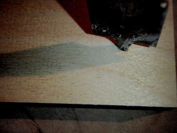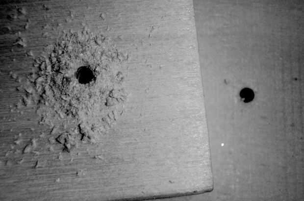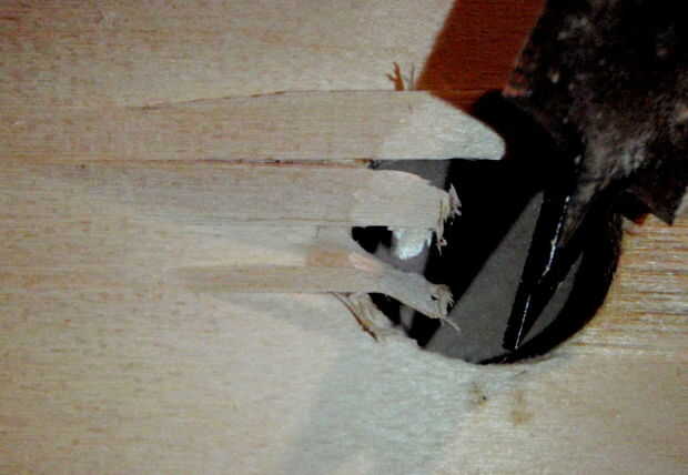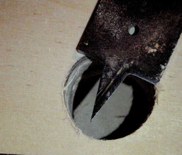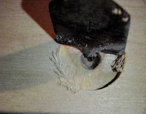Se perforó un orificio piloto de 1/8 de pulgada por cada rompecabezas de una pulgada y media desde el borde superior. La broca sólo debían ser lo suficientemente largos para perforar en el tablero por debajo de ella para marcar donde se taladraran los agujeros de una pulgada con un poco de mariposa. Para reducir la fragmentación de la mariposa poco fue utilizado en ambos lados de las juntas que los agujeros se reunieron en el centro.