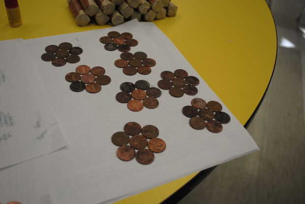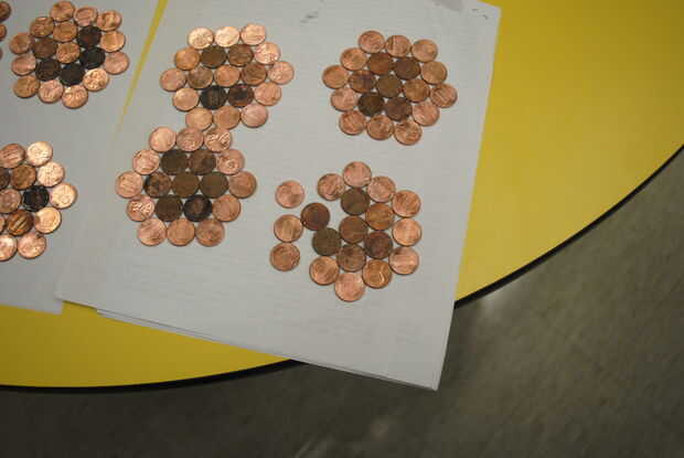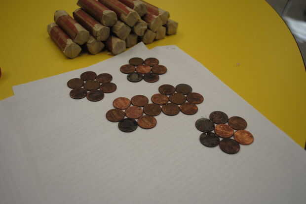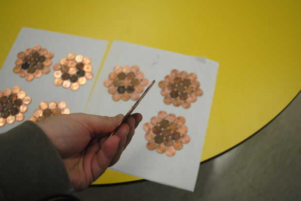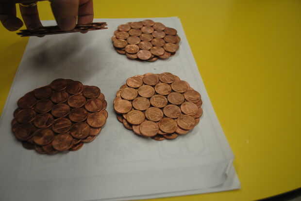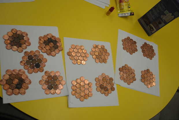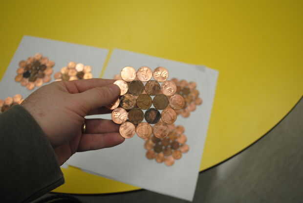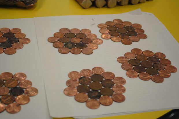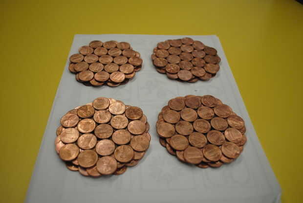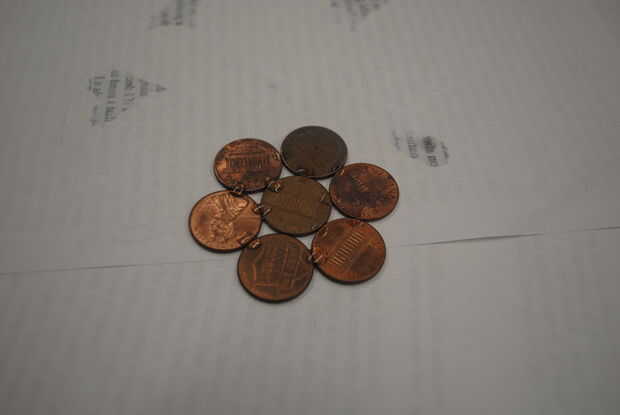 1.) he iniciar con la parte interna de cada capa, que consta de siete centavos y todos ellos que se necesita hacer. Primero probé apoyándolos a todos luego les pega. El problema es que el pegamento se filtrará a través de. Allí delante voy a través de este, por supergluing un solo centavo a la vez. En primer lugar, tengo dos monedas de un centavo al lado, luego un triángulo (3 penny), luego un rombo (4 de penique), y luego eventualmente un hexágono de pennies (monedas de 5-7).